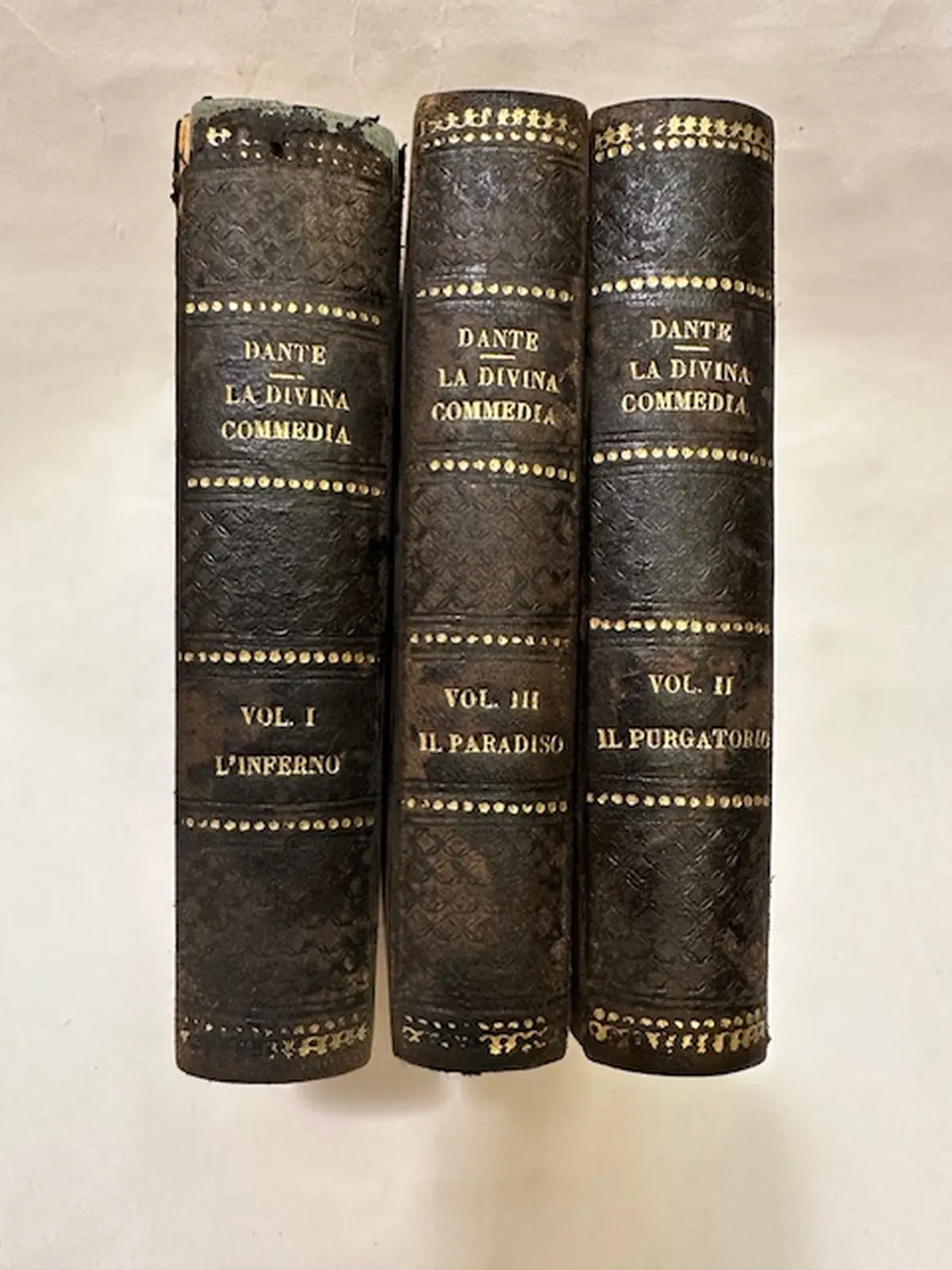 Opera in 3 volumi (Inferno - Paradiso - Purgatorio) con legatura coeva mezza pelle marrone, titolo e fregi oro al dorso (qualche abrasione, una mancanza di 2 cm all'angolo inf del primo volume ) ma buoni esemplari riccamente illustrati da numerose tavole fuori testo. Bella edizione della Commedia di Dante con ricche annotazioni di Niccolò Tommaseo.