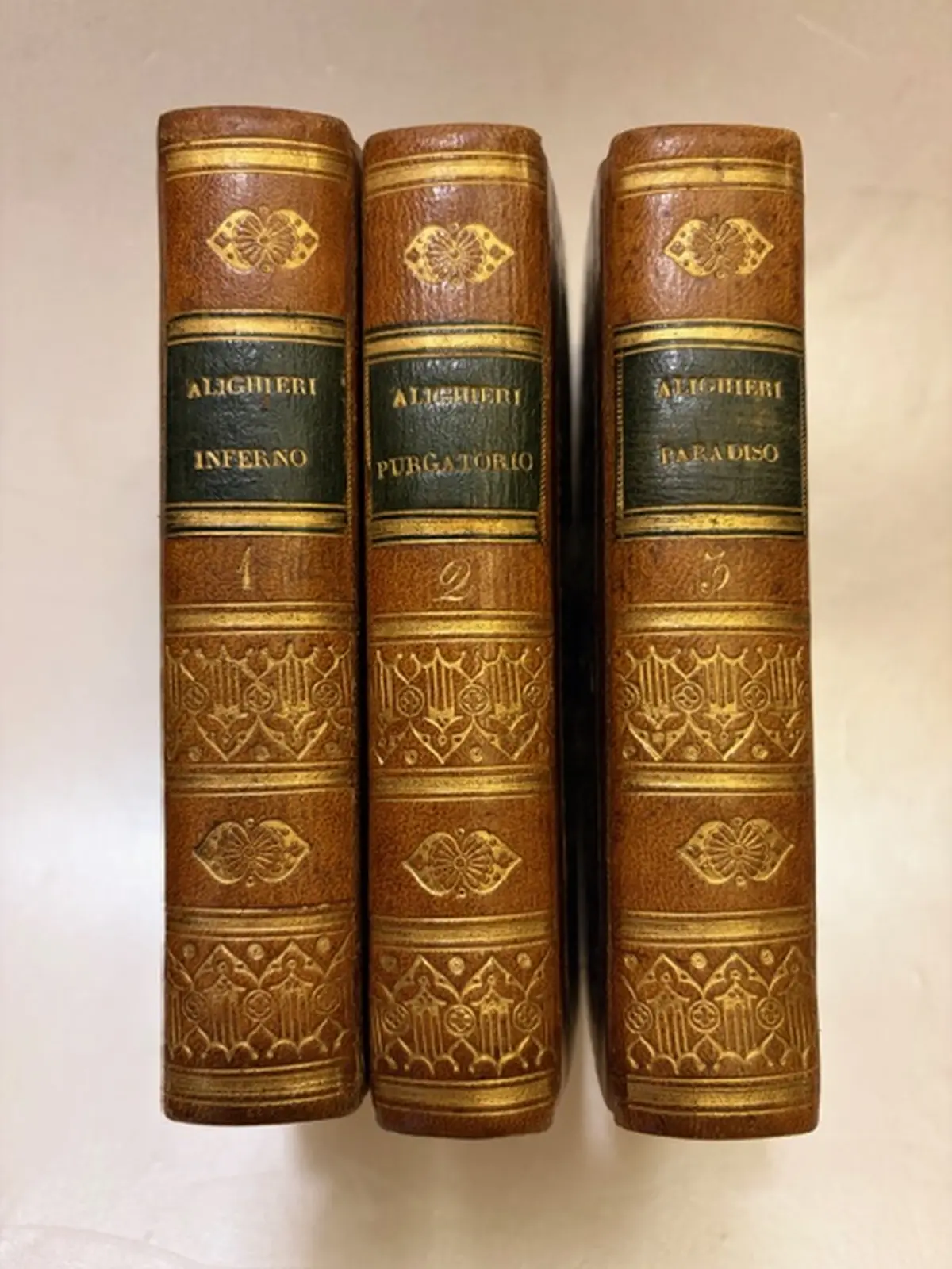 Opera in tre volumi con eleganti legature coeve mezza pelle con angoli, tasselli in colore ai dorsi con titolo e ricchi fregi in oro, ritratto di Dante al controfrontespizio del primo volume, condizioni ottime. La Divina Commedia pubblicata a Pisa da Sebastiano Nistri nel 1819, è un'edizione classica in tre volumi che riprende il celebre commento del XVIII secolo. Questa edizione è conforme al testo cominiano del 1727 e offre un'interpretazione tradizionale, nota per essere la prima a dare un commento letterale e storico.