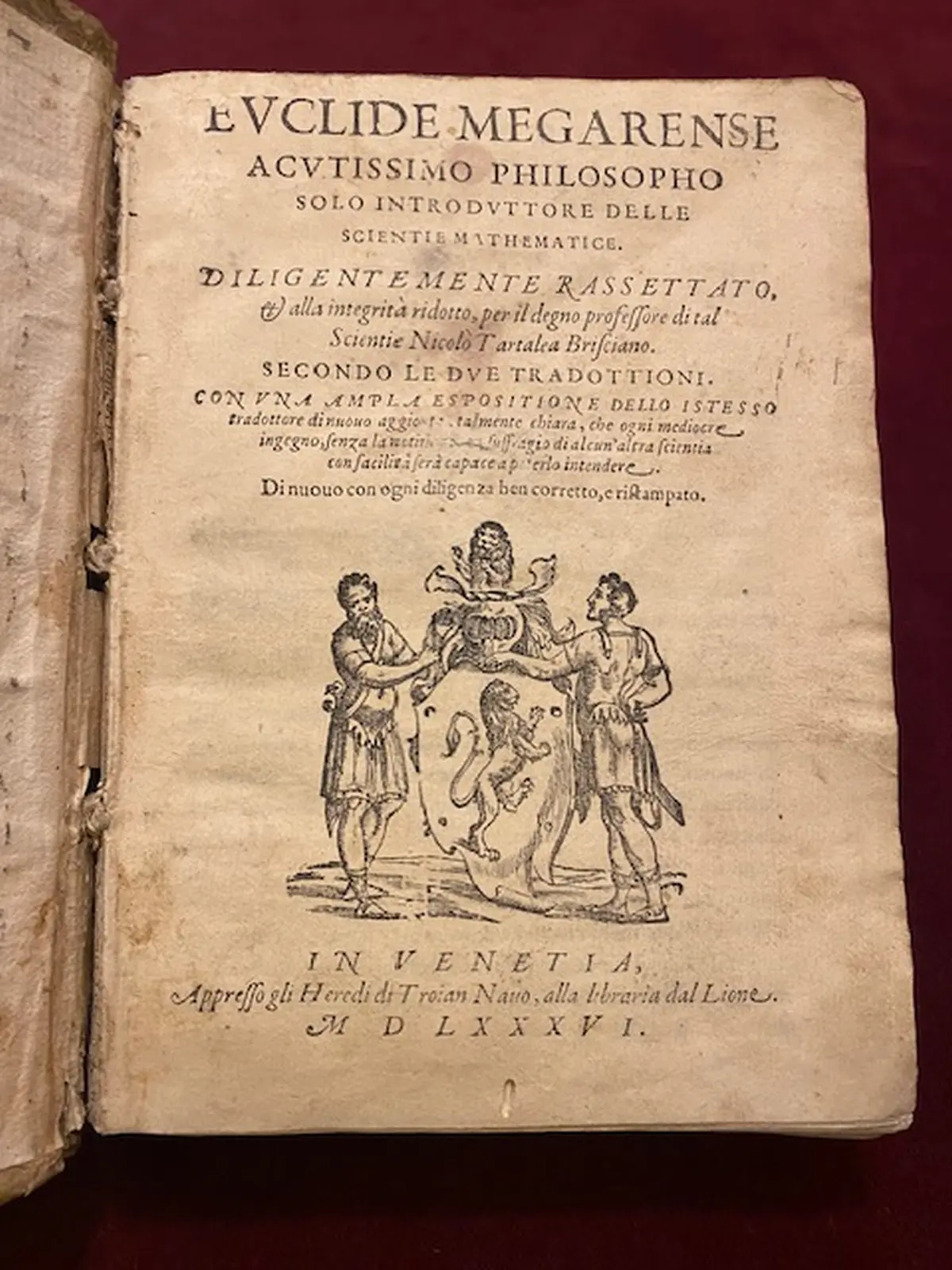 Euclide Megarense acutissimo philosopho solo introduttore delle scientie mathematice. Diligentemente rassettato, et alla integrità ridotto.per Nicolò Tartalea Brisciano. Secondo le due tradottioni. Con una ampla esposition dello istesso talmente chiara, che ogni mediocre ingegno… serà capace di poterlo intendere. Di nuovo con ogni diligenza ben corretto, e ristampato.
