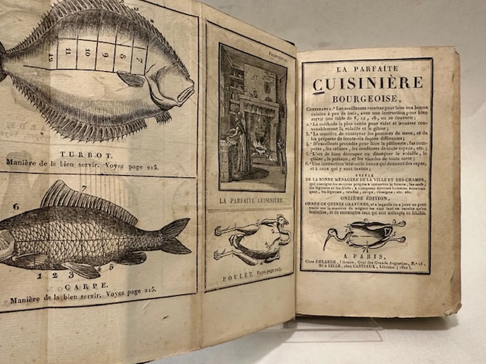 Elegante legatura leggermente posteriore in mezza pelle con titolo verticale in oro al dorso, dentelle dorate e piatti in seta verde a motivi floreali, buonissime le condizioni. Completo della grande tavola ripiegata in antiporta con 12 figure incise e numerate, raffiguranti parti di animali, pesci e l'interno di una antica cucina, altra incisione al frontespizio e altre due al recto del frontespizio. Con centinaia di ricette di gastronomia francese. Sc. D.
