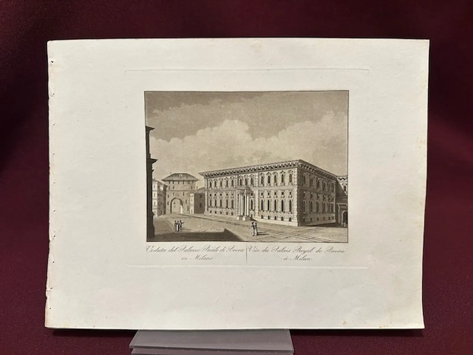 Bella veduta del Palazzo di Brera a Milano oggi sede della Pinacoteca, datata 1820 circa in ottima coloritura seppiata coeva. Stampa antica animata del Palazzo di Brera che si presenta in buonissimo stato di conservazione. Il foglio misura cm. 25,8x19,2.