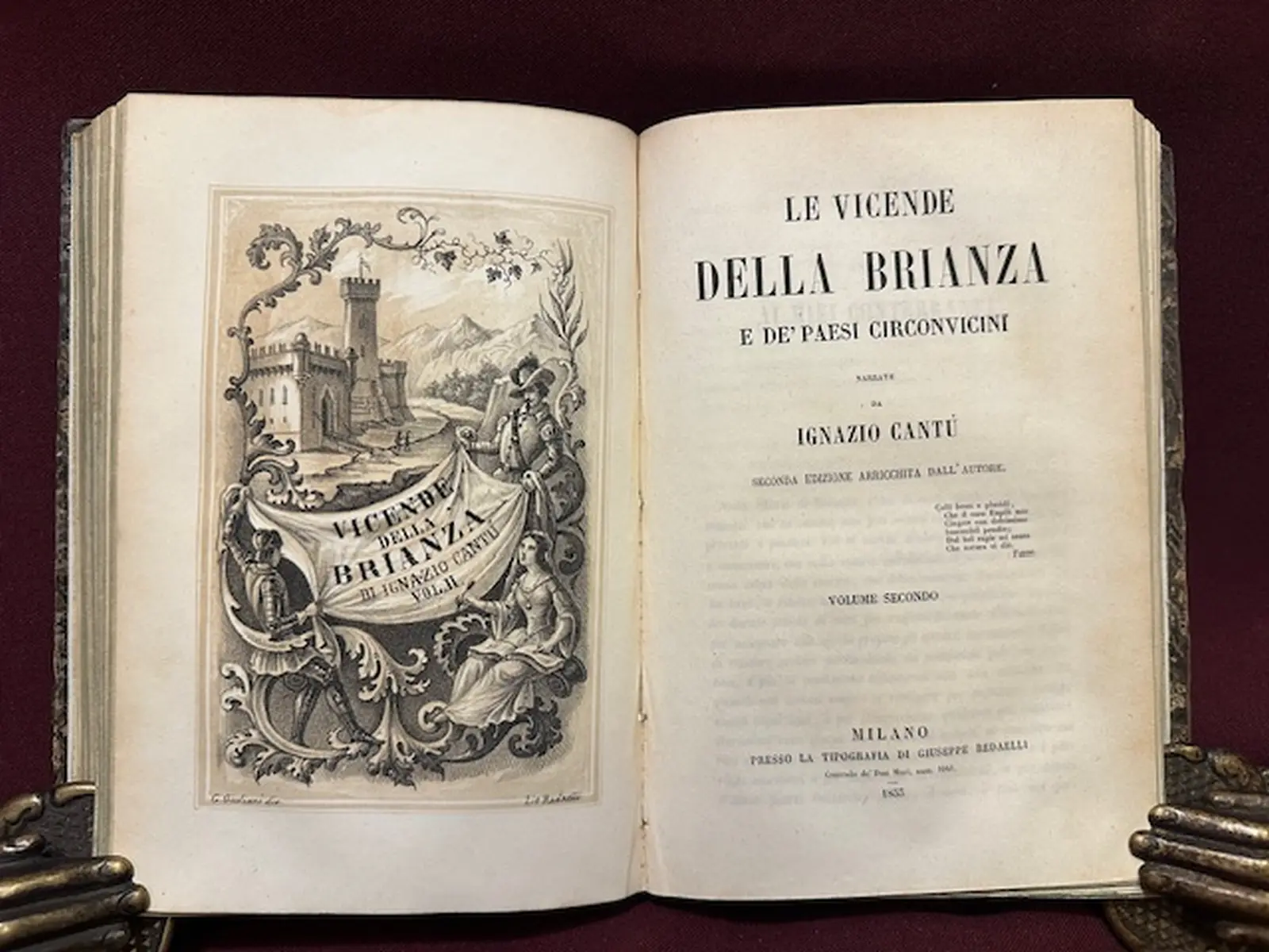 Opera in due volumi rilegati in un solo tomo con legatura coeva in mezza pelle, dorsi lisci con titolo, fregi e fregi in oro piatti marmorizzati condizioni buonissime, un restauro al margine inferiore del primo frontespizio. Con 12 belle tavole litografiche, di cui 2 all'antiporta dei volumi, disegnate da Giuliani e incise da Redaelli. Edizione più famosa, ampliata rispetto alla prima e arricchita del romantico apparato iconografico. Sc. V.