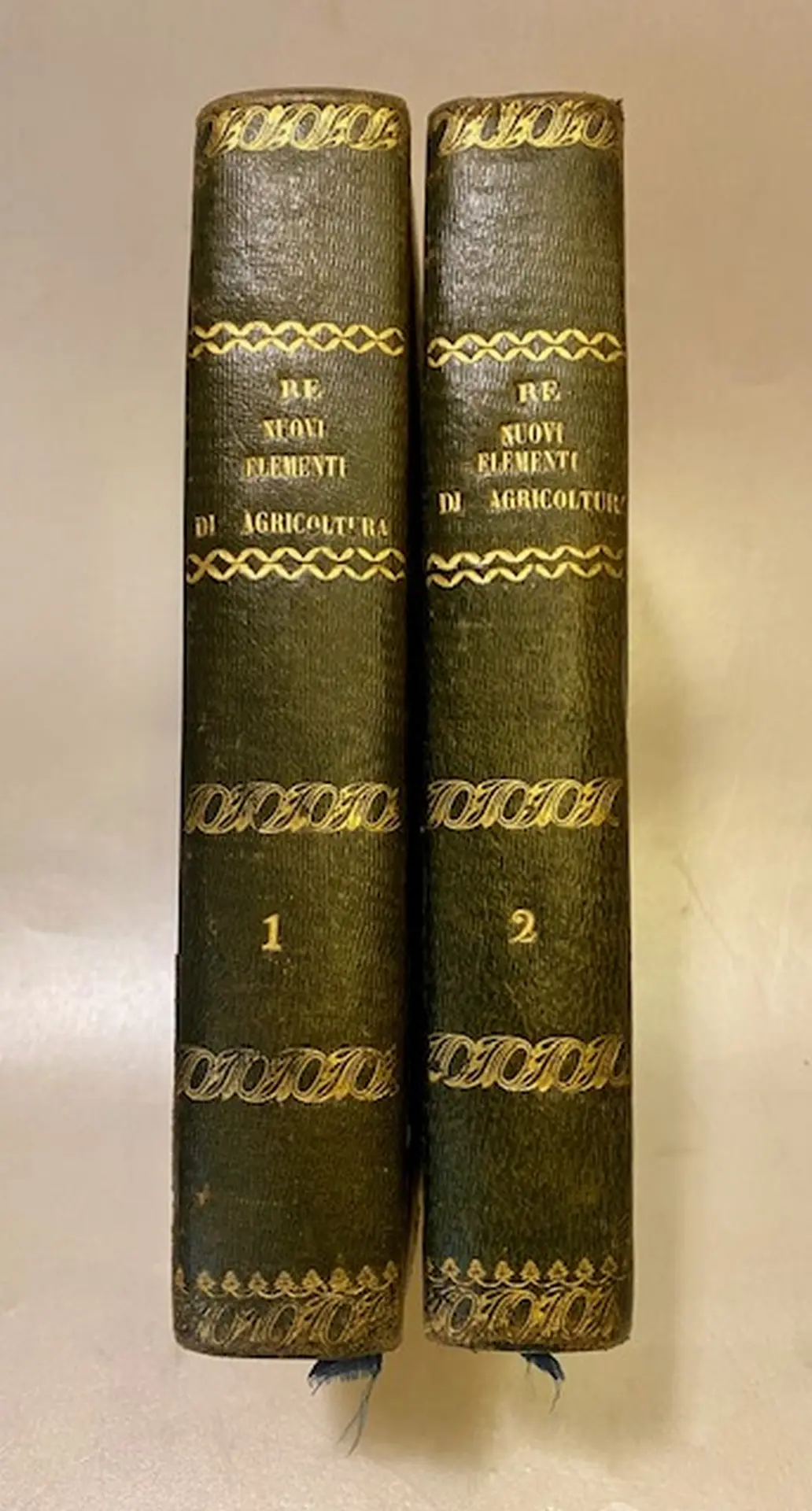 Bella legatura coeva in mezza pelle verde , titolo e fregi oro al dorso, segnacoli in seta originali, tagli di colore giallo, buone condizioni generali, ritratto dell'auore inciso all'antiporta e protetto da velina. Quattro volumi riuniti in due tomi. Importante trattato incentrato prevalentemente sulla coltivazione delle piante da reddito, da nutrizione e orticoltura. il libro nono è dedicato all'uva e alla vite. Filippo Re (1763-1817) fu un agronomo e botanico, docente universitario all'università di Modena. E' considerato uno dei massimi studiosi di agricoltura del suo tempo. Sc. T.