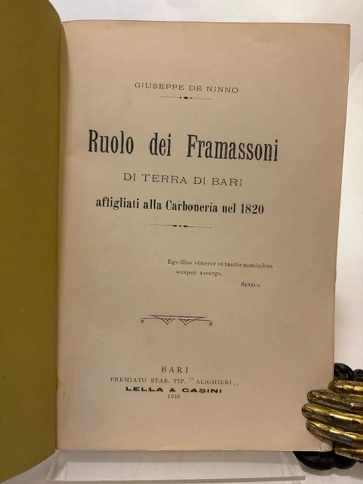 Brossura editoriale mantenuta solo al piatto posteriore e al dorso, piatto anteriore muto non originale, copia ottima. In ordine alfabetico l'elenco di tutti gli allifiati alla Framassoneria al 1820 nella provincia di Bari. Di tutti biografia e ruolo ricoperto all'interno. Interessante e raro.