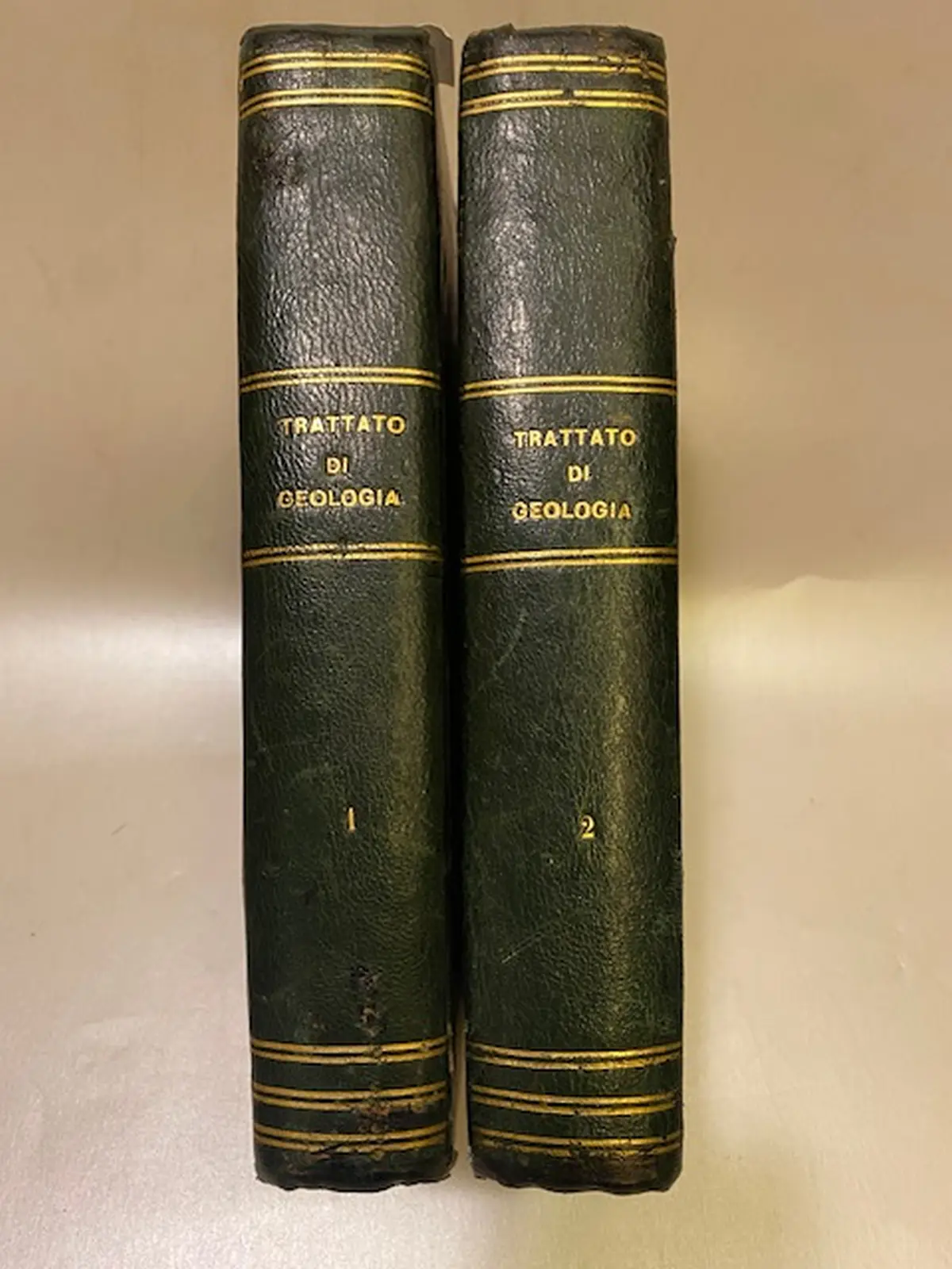 Bella legatura coeva in mezza pelle verde , dorso con titoli e filetti in oro, lievissime bruniture a poche carte, esemplari ottimi. Con 263 illustrazioni xilografiche nel testo, 6 tavole in litografia di cui due a colori ed una tabella ripiegata fuori testo. Importante trattato di geologia dello studioso Leopoldo Pilla, di cui il secondo volume uscì postumo. Sc. M.