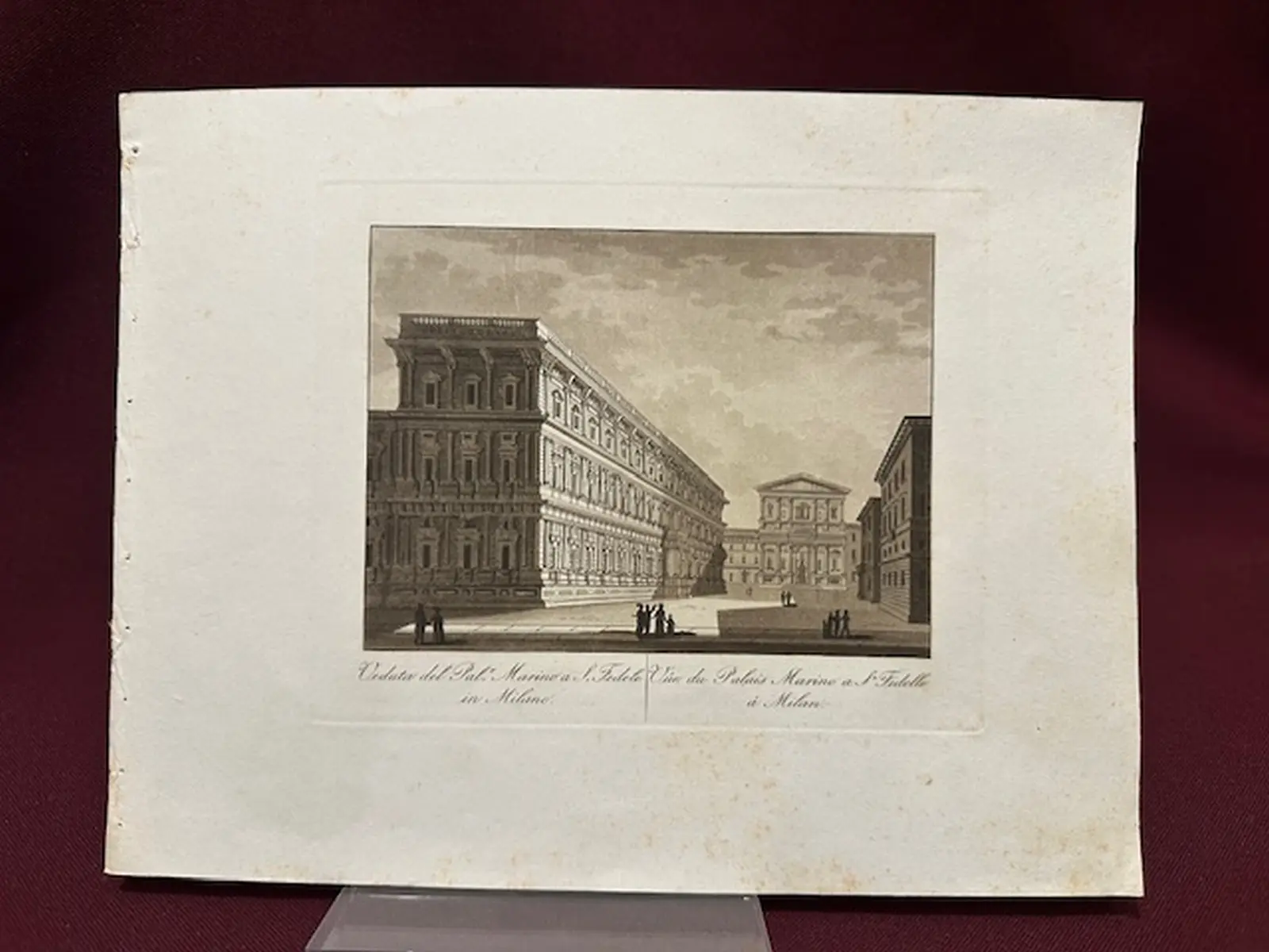 Bella veduta di Palazzo Marino di Milano datata 1820 circa in ottima coloritura seppiata coeva. Stampa antica animata di Palazzo Marino e piazza antistante che si presenta in buonissimo stato di conservazione. Il foglio misura cm. 25,8x19,2.
